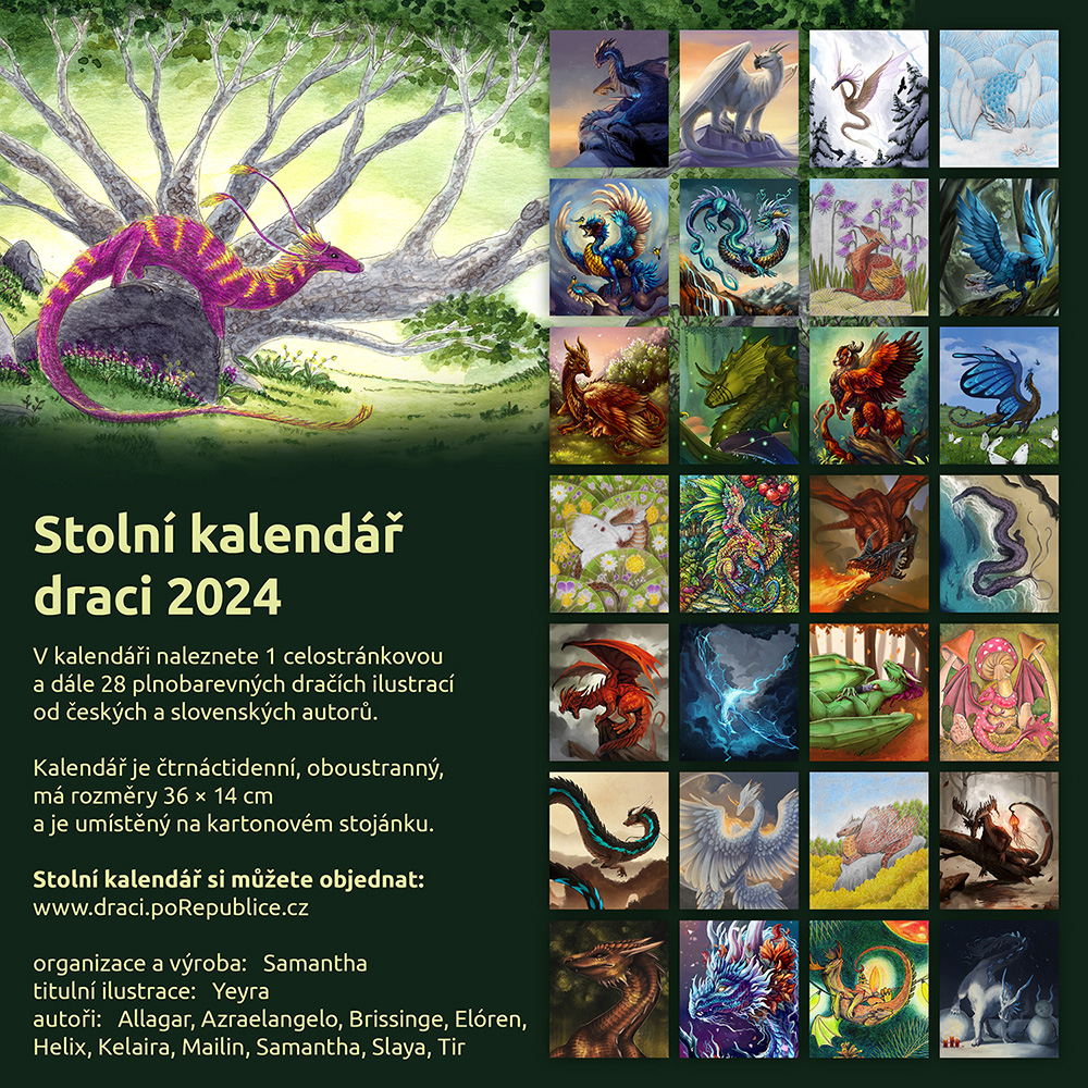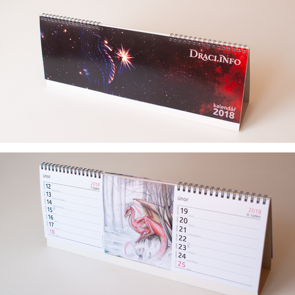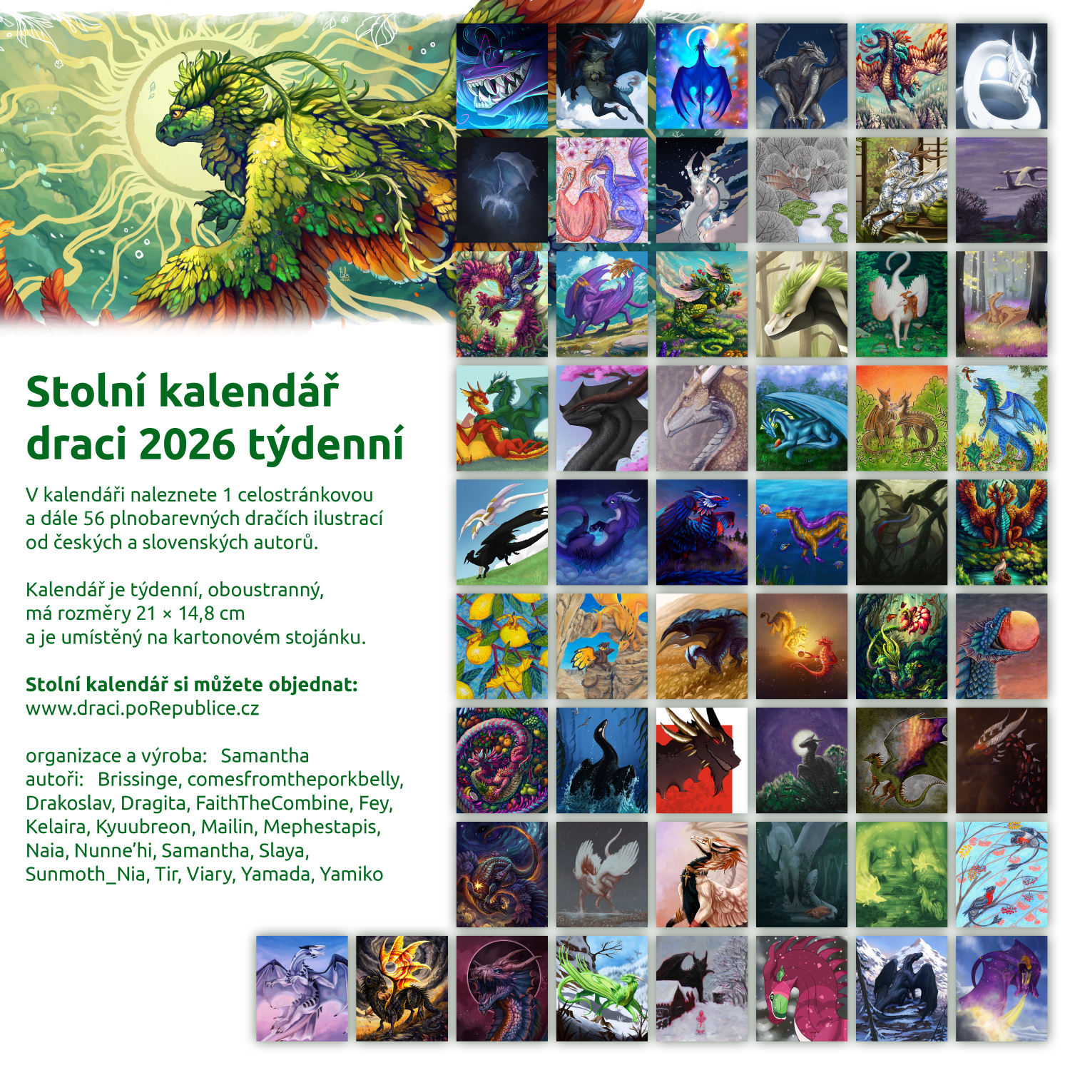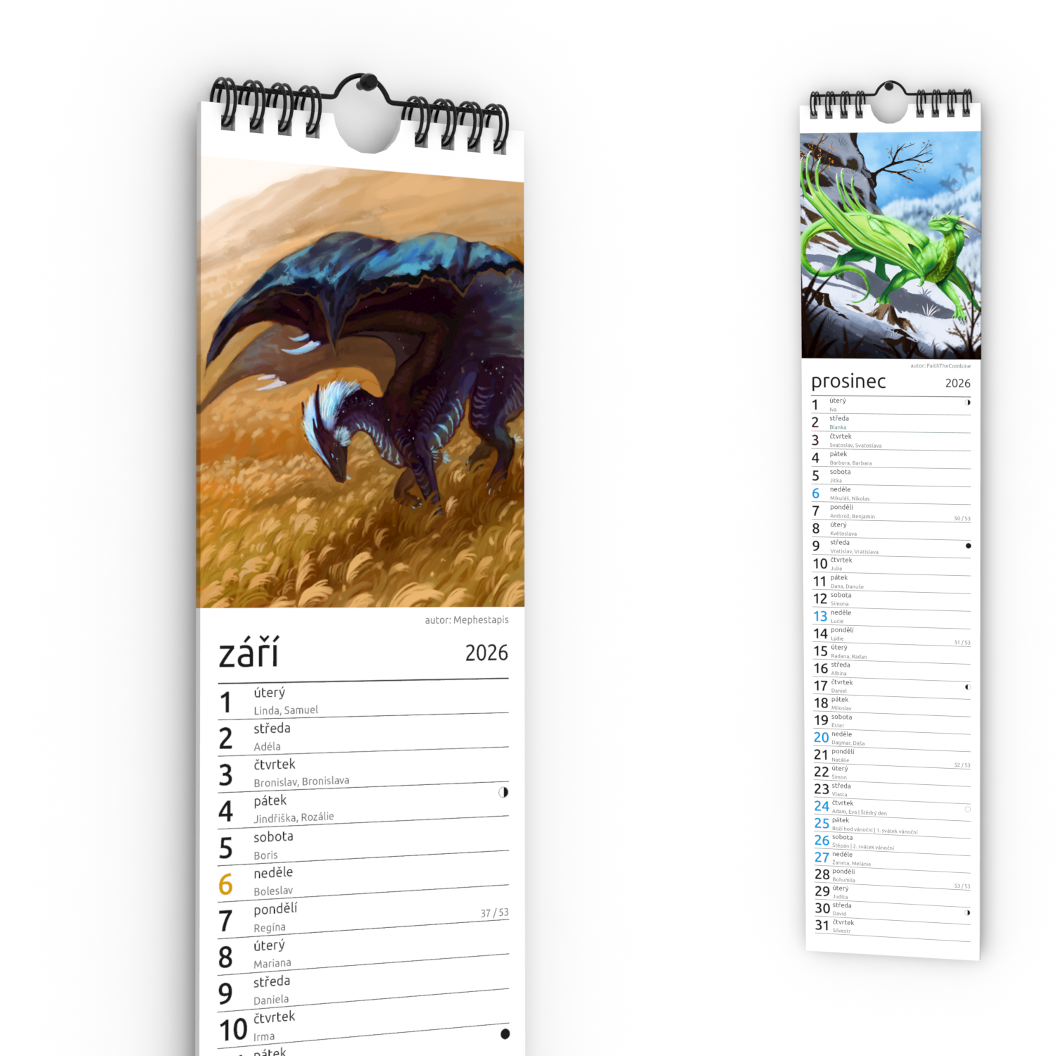 A pozor, nejen že se nám i letos povedlo shromáždit dostatek ilustrací na týdenní kalendář, ale pro vás máme letos další novinku - měsíční nástěnný kravatový kalendář! Máte málo místa na stole, nebo nemáte stůl žádný, a přesto byste chtěli dračí kalendář s podrobným kalendáriem? Ideální řešení je kravatový kalendář - úsporný na prostor, podrobné kalendárium (státní svátky, měsíčky, změny času, čísla týdnů) s prostorem na poznámku a 12 top ilustrací, každá od jiného autora.