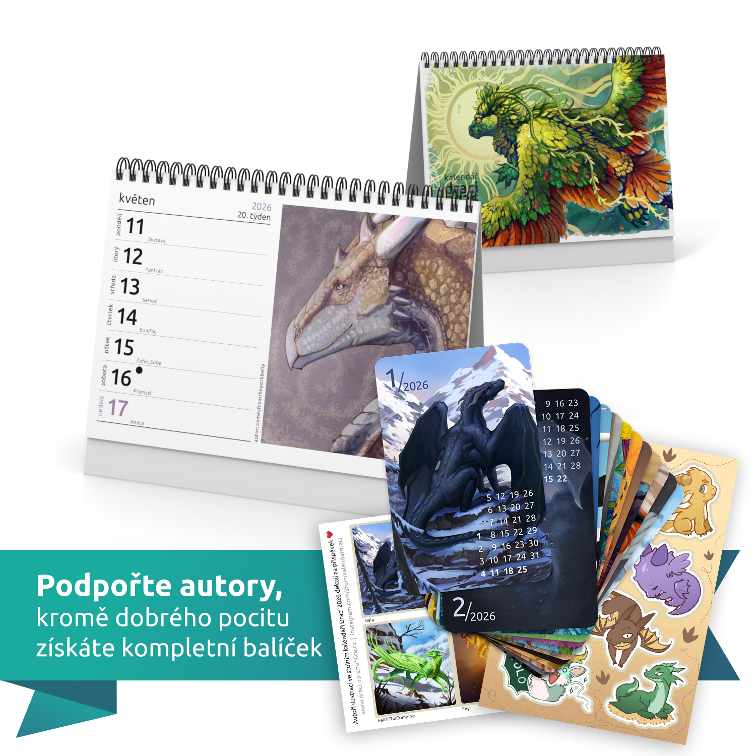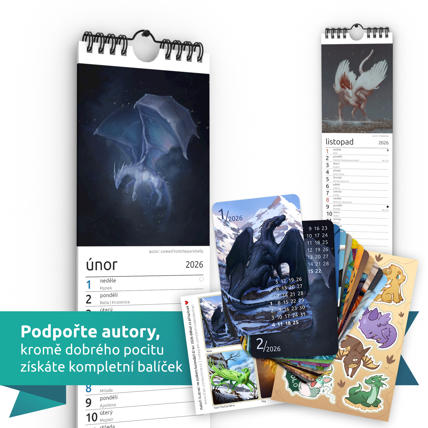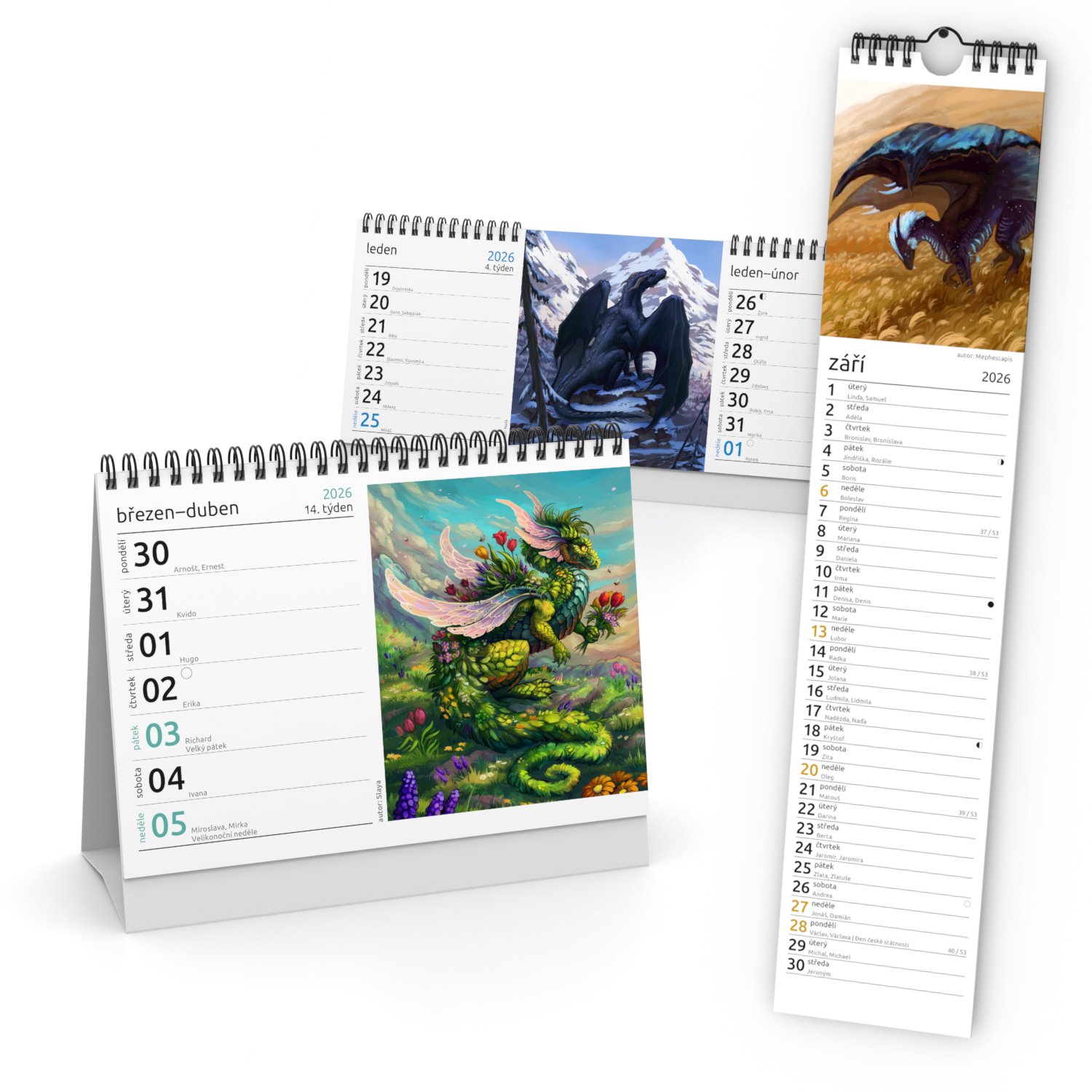 A pozor, nejen že se nám i letos povedlo shromáždit dostatek ilustrací na týdenní kalendář, ale pro vás máme letos další novinku - měsíční nástěnný kravatový kalendář! Máte málo místa na stole, nebo nemáte stůl žádný, a přesto byste chtěli dračí kalendář s podrobným kalendáriem? Ideální řešení je kravatový kalendář - úsporný na prostor, podrobné kalendárium (státní svátky, měsíčky, změny času, čísla týdnů) s prostorem na poznámku a 12 top ilustrací, každá od jiného autora.