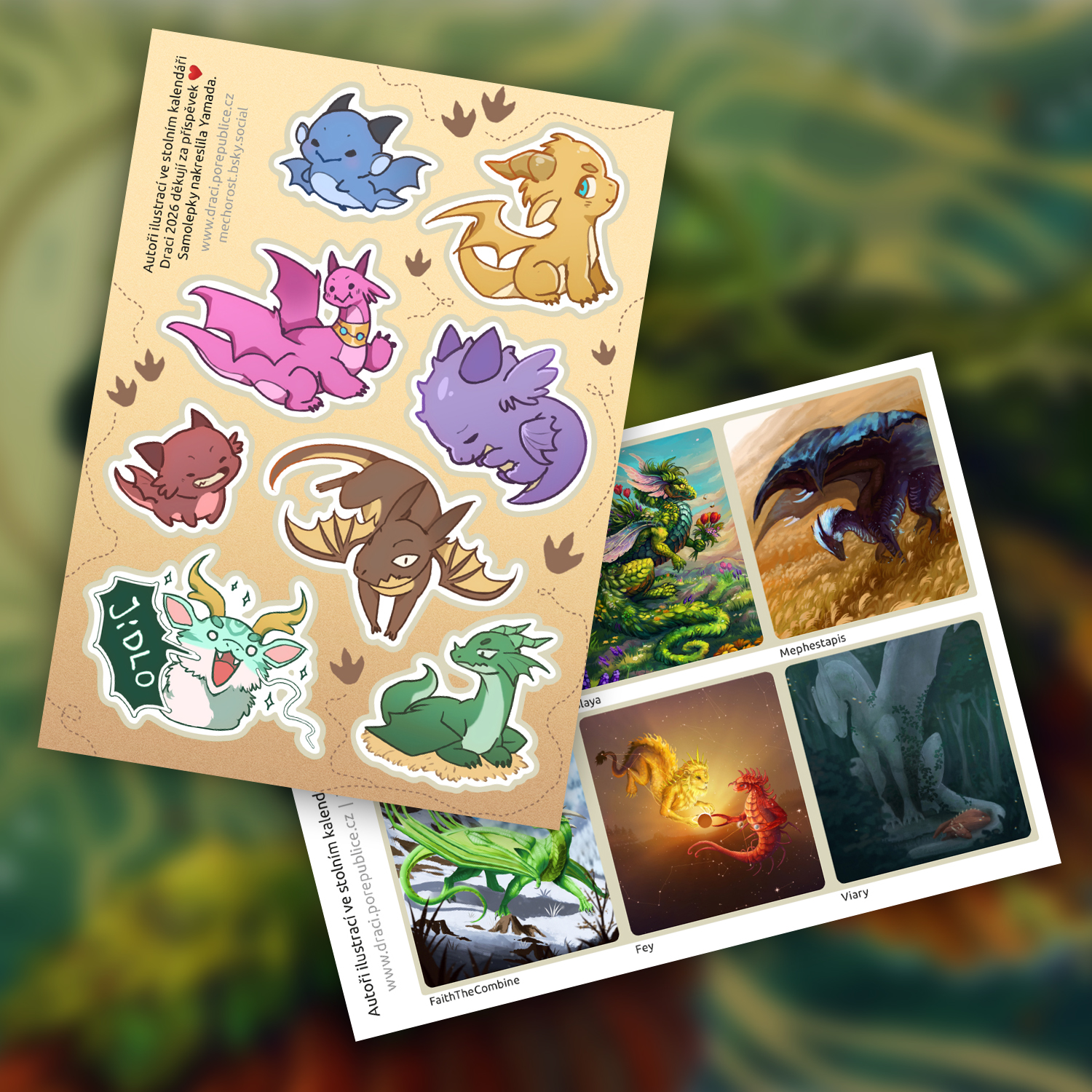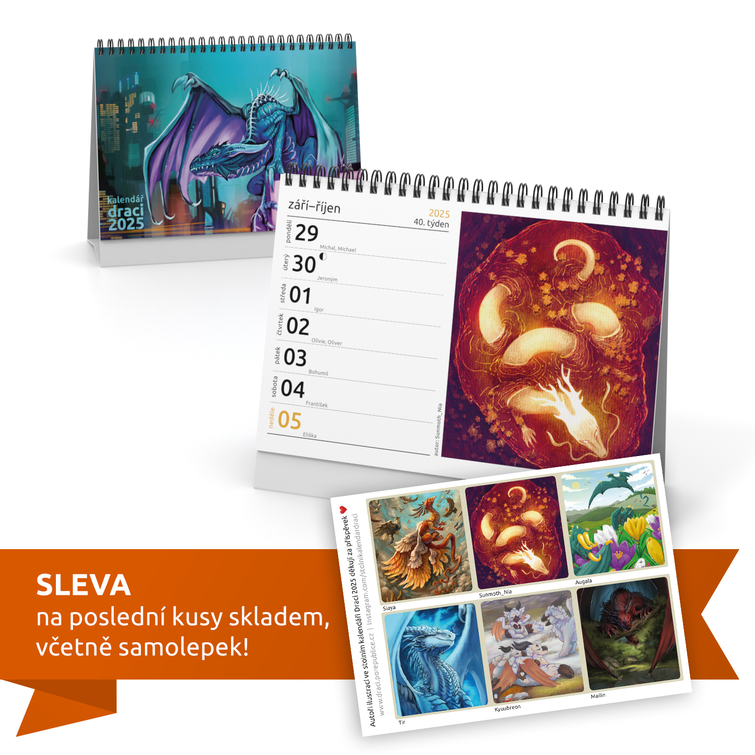 Novinka ročníku 2025: kalendář Draci v týdenním uspořádání a s dvojnásobnou porcí ilustrací! Má rozměry 21 × 14,8 cm (A5), uvnitř naleznete 1 celostránkovou a dále 56 plnobarevných dračích ilustrací (polovina je shodná s ilustracemi ve čtrnáctidenní variantě). Doprodej se týká varianty s dárkem v podobě aršíku samolepek.Samolepky jsou vytištěny na papírové samolepce, každá o rozměru 50 × 56 mm, a nesou motivy šesti nejoblíbenějších ilustrací od různých autorů. Na náhledy všech ilustrací uvnitř můžete kouknout zde.