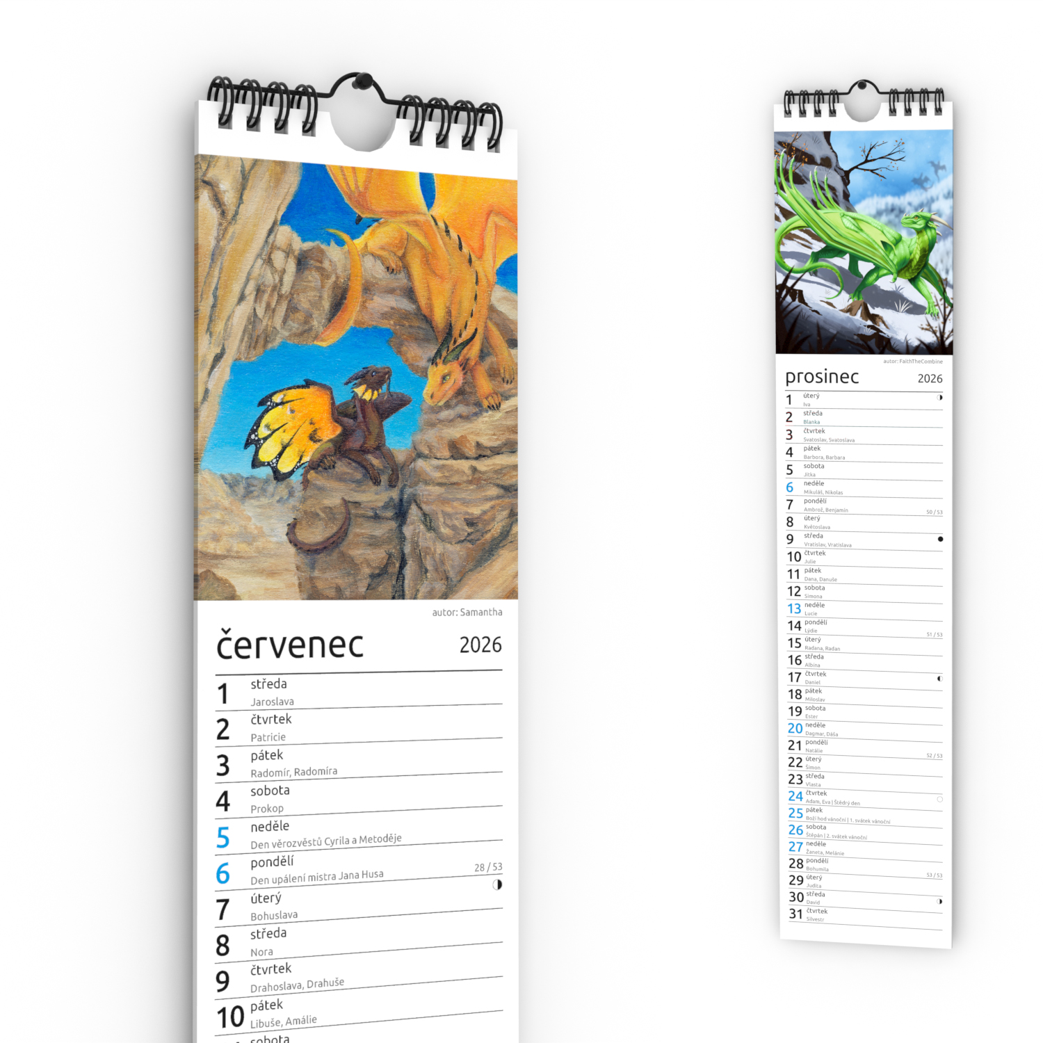 Novinka: kalendář Draci je letos k dispozici také v měsíčním uspořádání, s podrobným kalendáriem ale k zavěšení! Má rozměry 9,5 × 45 cm, uvnitř naleznete výběr 12 plnobarevných dračích ilustrací, každou od jiného autora.
