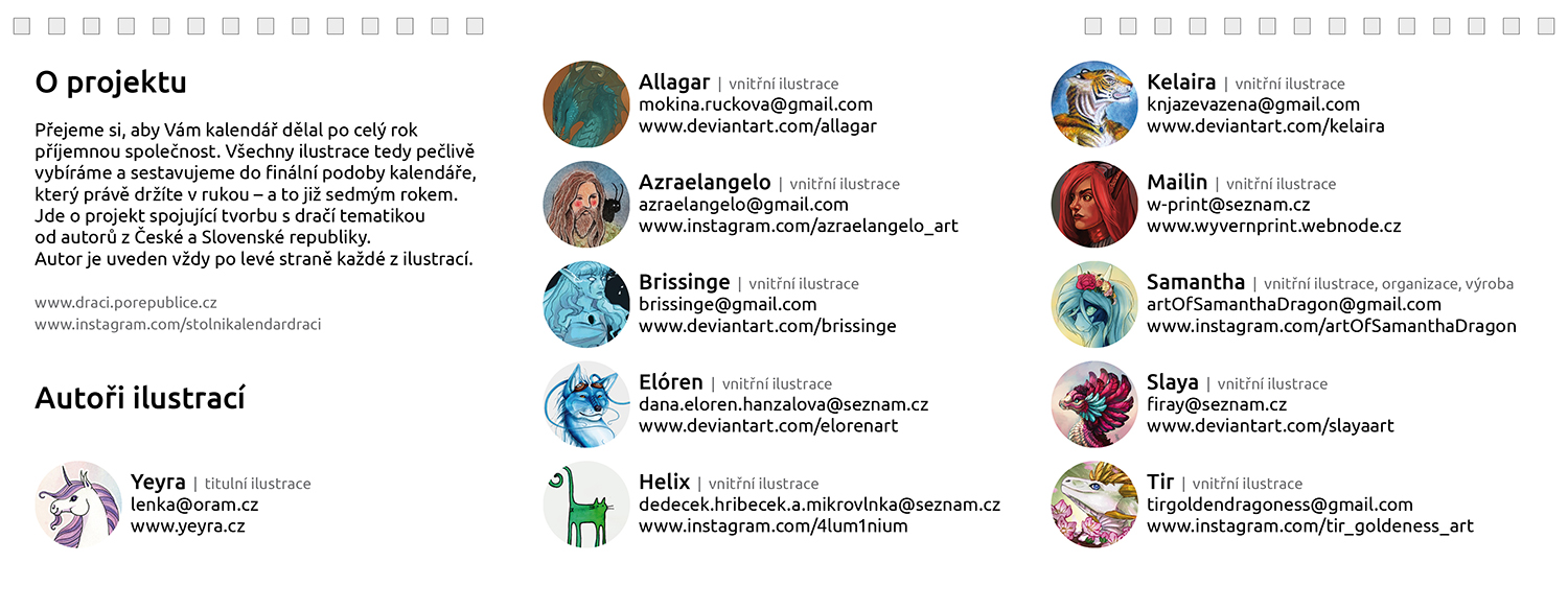 • Do projektu stolního kalendáře Draci může svou tvorbou přispět každý český nebo slovenský ilustrátor (po souhlasů všech autorů může být přihlášeno i společné dílo).